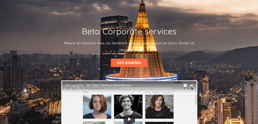 Beta Divi Page Layout is a one-page layout designed for corporations and businesses. The full-screen header slider includes a title, tagline, CTA, and an embedded video. Blurbs are used to show benefits and use a minimal design. Blurbs are also used to show services with a similar design but with a black background for the icons and red text for the link. Other elements include a full-width portfolio, testimonial slider, person modules with hover animation, circle counters, pricing tables, a blog with alternating layout, blurbs for contact info, contact form, and map.