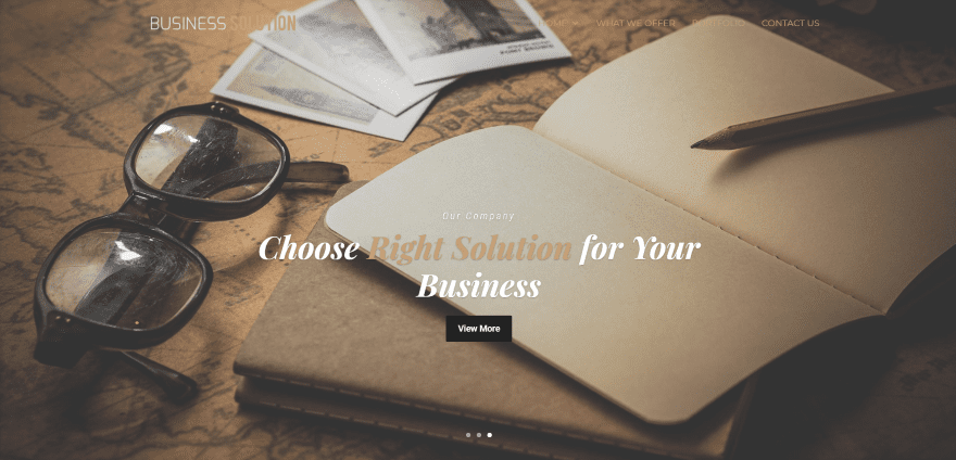 Business Solution includes 3 home pages to create any type of business. The first uses a full-screen slider with title and CTA, while the other two use a hero image with title, tagline, and CTA. Services are displayed with blurbs to create full-width cards, or as blurbs over a background both with and without icons. Work is displayed in two columns with one column showing an image and the other showing a filterable portfolio. Benefits are displayed in two columns with an image and icons for bullets. Other styled elements include testimonials over a background, number counter, person modules, map, contact form, pricing table, blog, and more. Client logos are displayed in a slider.