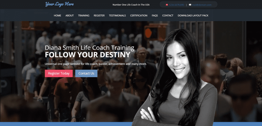 Coach is a one-page layout for business and life coaches. It displays a video header with image, headline, tagline, and CTA’s in an overlay. The image overlaps the next section that includes class information. Following this is an information section with an image, text, and bar counters. Another section shows services with images using border effects and text separated with dividers. A colorful pricing table includes a built-in registration form. Styled testimonials and toggles display multiple colors.