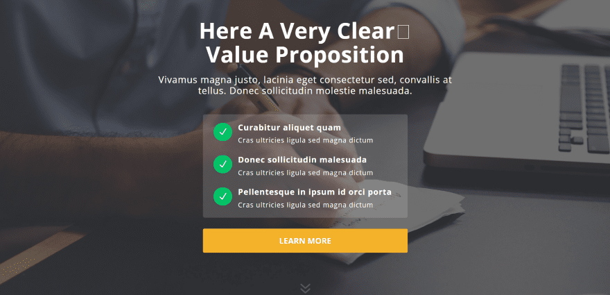 Converter is a sales page that was designed using the A.I.D.A (Attention, Interest, Desire, Action) method of conversions. It was designed for products, webinars, video course, and services. The header displays a title, tagline, benefits as bullets, and CTA in an overlay. Scrolling reveals several information sections that include animation. They include light and dark backgrounds, display bullets, icons, images, and testimonials. An embedded video is placed within a desktop monitor. A pricing CTA includes a countdown timer. Styled testimonials display over a background in parallax. The footer shows client icons.