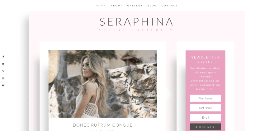 Seraphina Layout Pack is a 5 page layout (which is ideal to create a complete website) for female entrepreneurs that includes home, about, gallery, blog, and contact pages. It has a boxed design with shadow effects that create a nice 3D look. The header displays the title followed by an image and email opt-in form. An about section offsets an image with an information box. Services are shown with images in a multi-column layout. Modules are elegantly separated by arrows. It includes lots of styled modules such as a quote, blog, and social follow buttons. It also has an embedded snapwidget slider. The blog page includes a sidebar with styling that matches the layout.