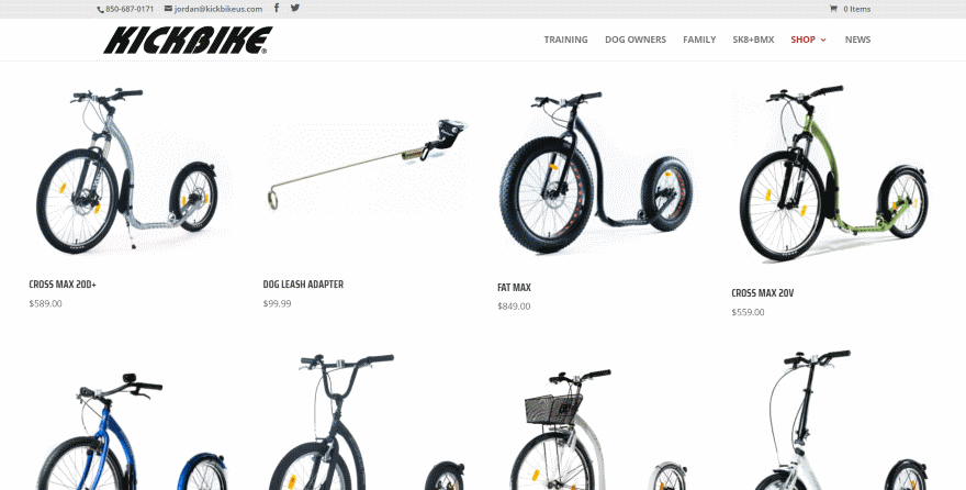 This one uses a clean design for the two-column shop module, which displays a large image over the title, text, and button for each item. The product page displays an image slider, all the expected text, styled buttons, toggles for the pricing information by country, embedded video, and another round of toggles for all the information about the product.