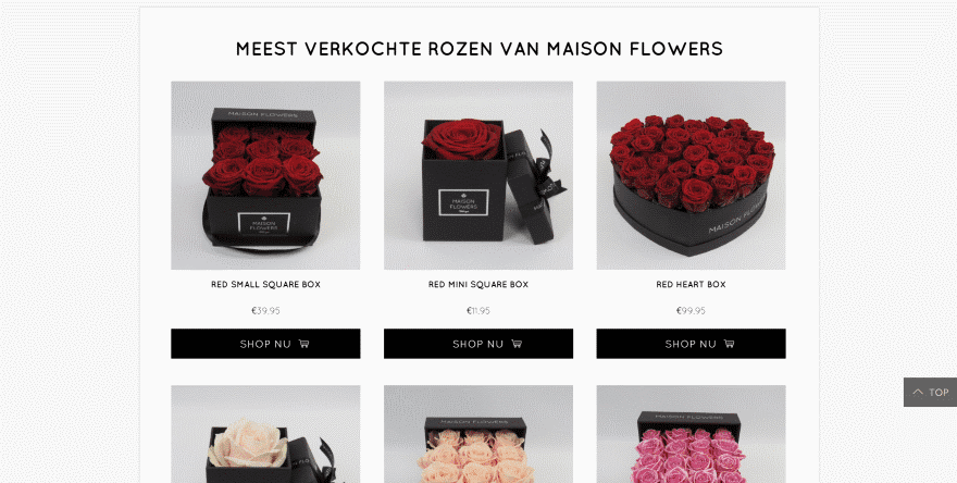 This one displays the shop module within a styled row with a boxed shadow effect. The text and buttons are styled black to match the company’s branding. The products use a slightly dark overlay with a unique rose icon. The product pages use gray styling for the highlights and also includes a styled shop module to display similar products.