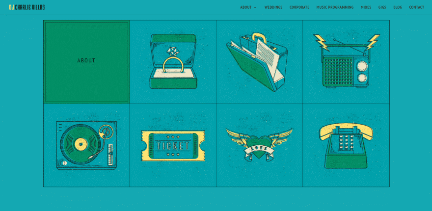 DJ’s often utilize stylized graphics to connect with their audience. This one provides the standard primary menu and text links, but there’s another menu at the bottom of the simple homepage that displays illustrations that fit within the style of the website. This menu works as a call to action to the various pages and services. The illustrations show visually what the link is for. Hovering over a graphic reveals the text that matches the primary menu. It includes hover animation.
