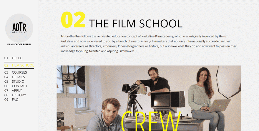 Here’s another effective use of numbered navigation. A topic as unfamiliar as film school needs to step potential students through the process. This numbered navigation does that. The menu is provided vertically and remains on screen at all times. As you hove over the menu the links reacts and highlights that link. Hovering over the screen reveals where you are within the menu. Each of the sections are numbered to match the navigation.