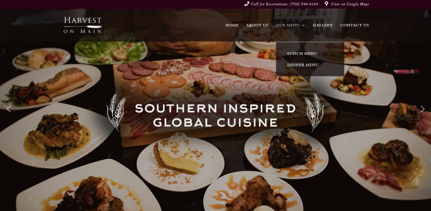 Restaurants need to provide contact information for directions, reservations, and a food menu that’s easy to find and understand. The navigation in this website provides all of that in a simple structure. It adds a clickable phone number and link to Google Maps in the secondary menu with icons so they’re easy to understand at a glance. Links to the food menu are easy to use in the primary menu.