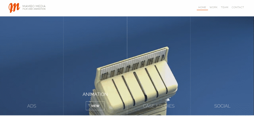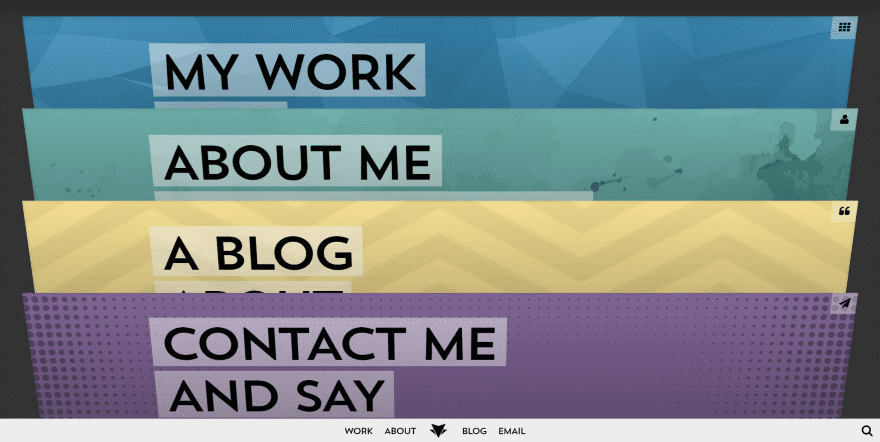 This one creates a unique navigation for the portfolio. It adds the menu structure directly into the hero area, displaying animated links to the portfolio over a background video. The video only plays while hovering, which means the links are directly in your view so you don’t have to go looking for them. This is an interesting way of making the portfolio visual while keeping it out of the way at the same time. Even though the links are placed over the video, the hero area still looks clean.