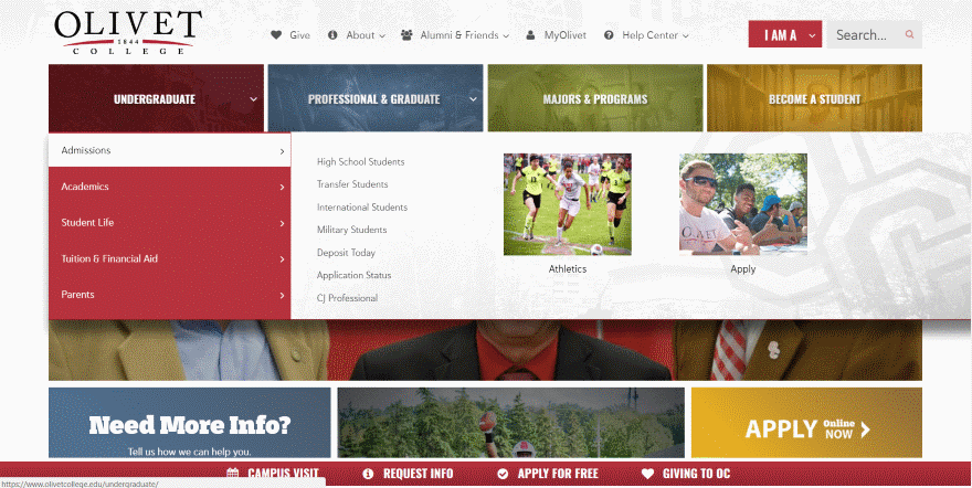 That Olivet College has the most complex navigation I have ever seen. Not convinced their solution is entirely on the mark, but its far from easy with that level of complexity.