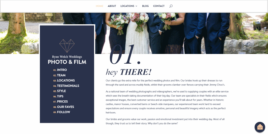 Photographers typically need to provide information about themselves and the work they do, like any good portfolio, but they also need to step the potential client through the process. This one uses a numbered navigation design and places the navigation within a box that overlaps the hero section. On scroll, the numbered navigation is added under the primary menu, making it easy to step through the process. Each of the sections are numbered to match.