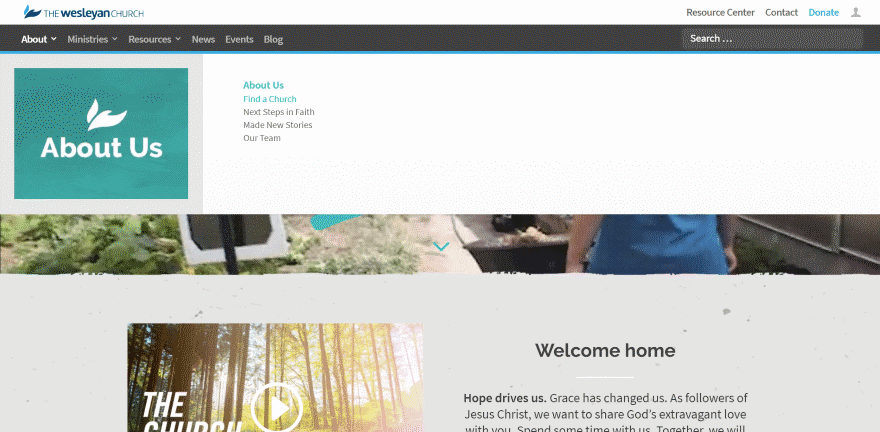 Churches need information about the Church, events, ministries, resources to learn more, location, and a donation link. This one includes all of those elements in either the primary or secondary menu. The primary menu is a mega menu with a graphic and simple links to that category. The donation call to action is blue, so it stands apart without standing out too much. The colors work perfectly for the site’s design.