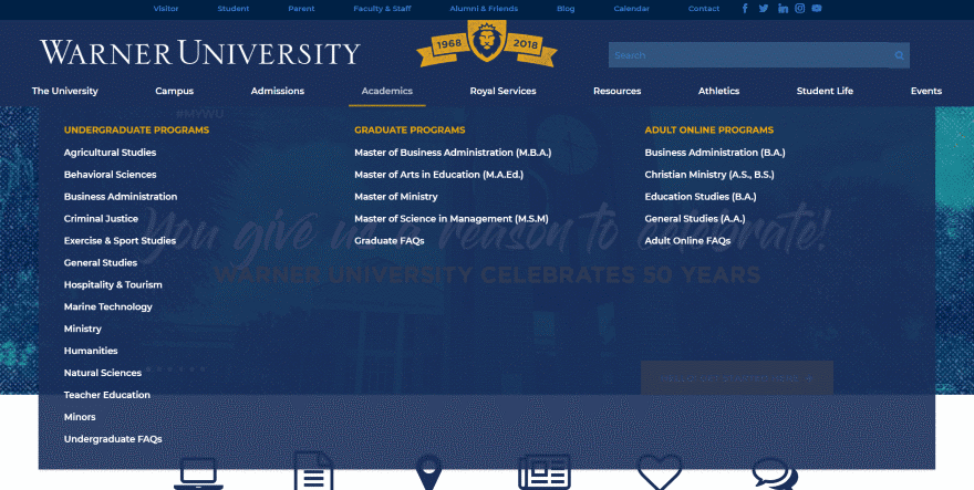 Schools have to provide a ton of information for several different purposes and audiences including teachers, students, prospective students, parents, and information about the campus, courses, online courses, admissions, and lots more. It’s difficult to provide that amount of information in a way that’s easy to find. This one accomplishes the goal with a mega menu that breaks the major topics into sub-topics and displays them in columns. The secondary menu provides another round of links, but it’s easy to understand that those topics are not within the primary menu so you’re not looking in the wrong places.