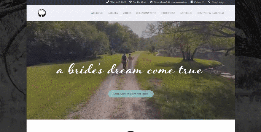 Locations that caters to certain types of events need to provide lots of information about the events and the surrounding area. The links within this website’s primary menu are easy to understand and follow, but it’s the secondary menu that I’m drawn to. It provides links that includes a clickable phone number, bridal information, a website for cabin rentals, the company’s Facebook page, and Google Maps. Each of the links include icons so you can tell at a glance what they’re for.
