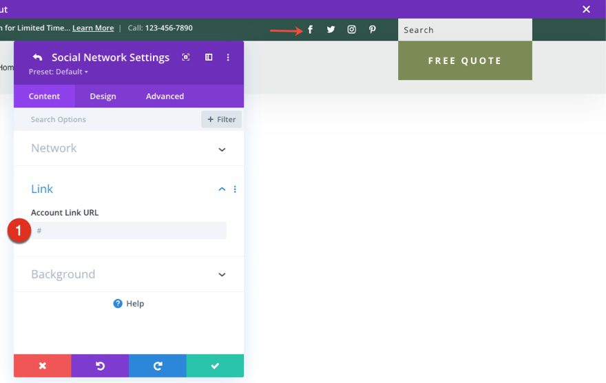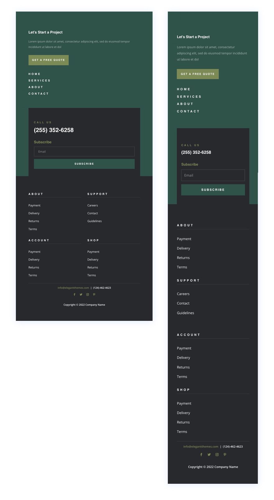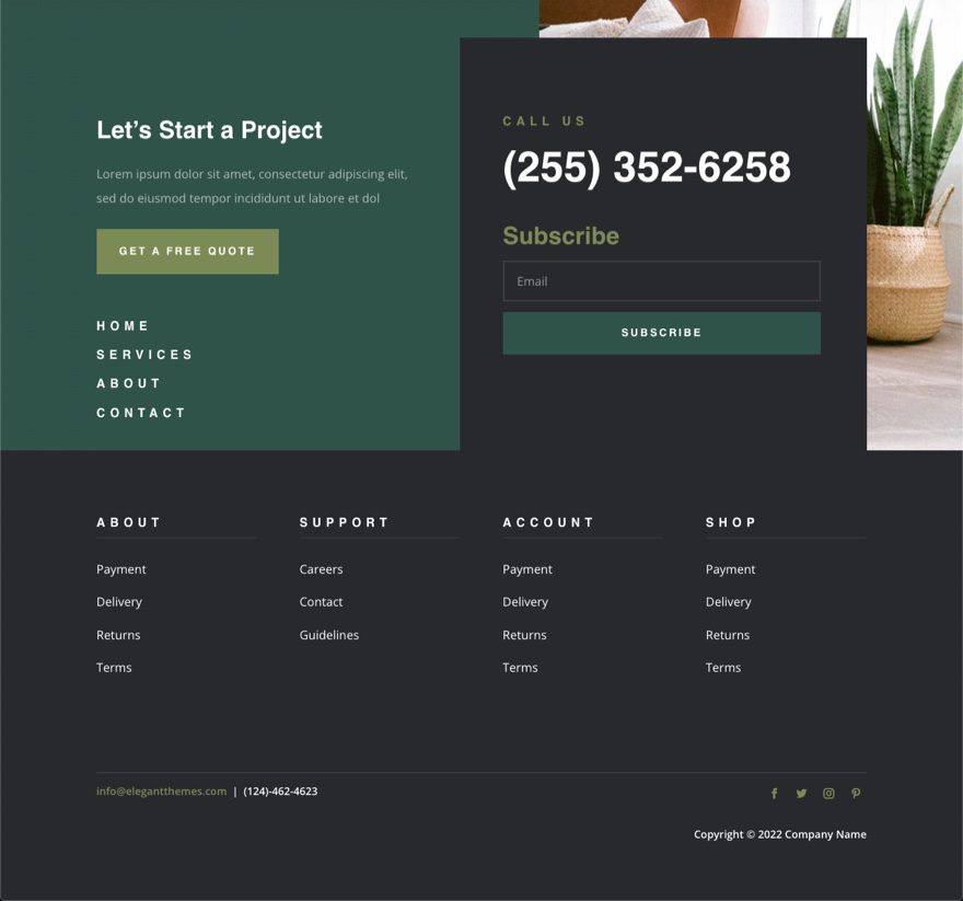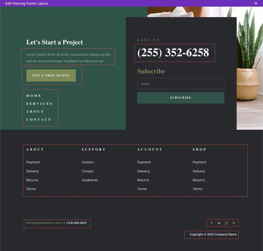 You will also need to go through and update the content of the footer, including adding your own text, link URLs, and social media networks. Don’t forget about the copyright text at the bottom of the footer as well.