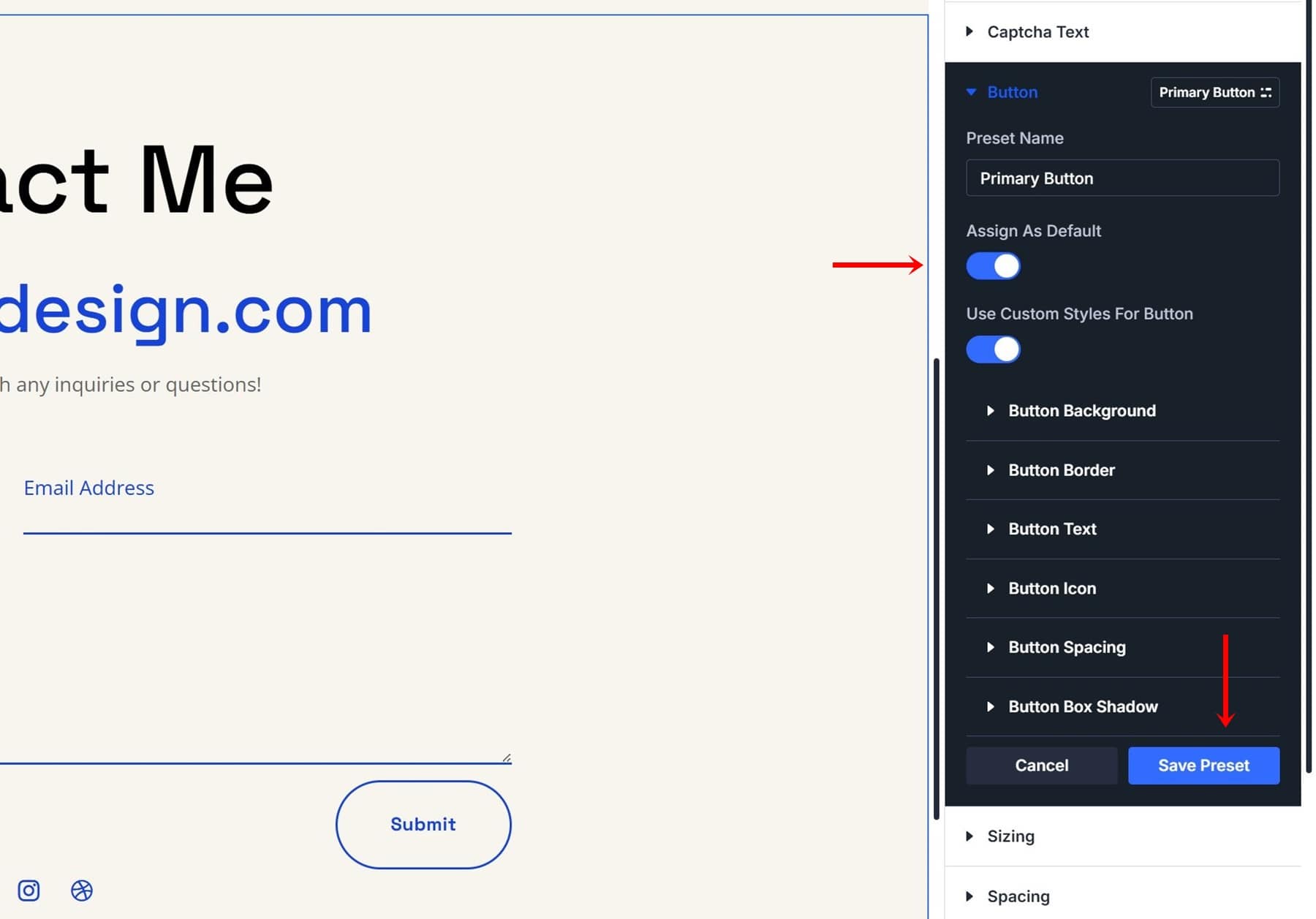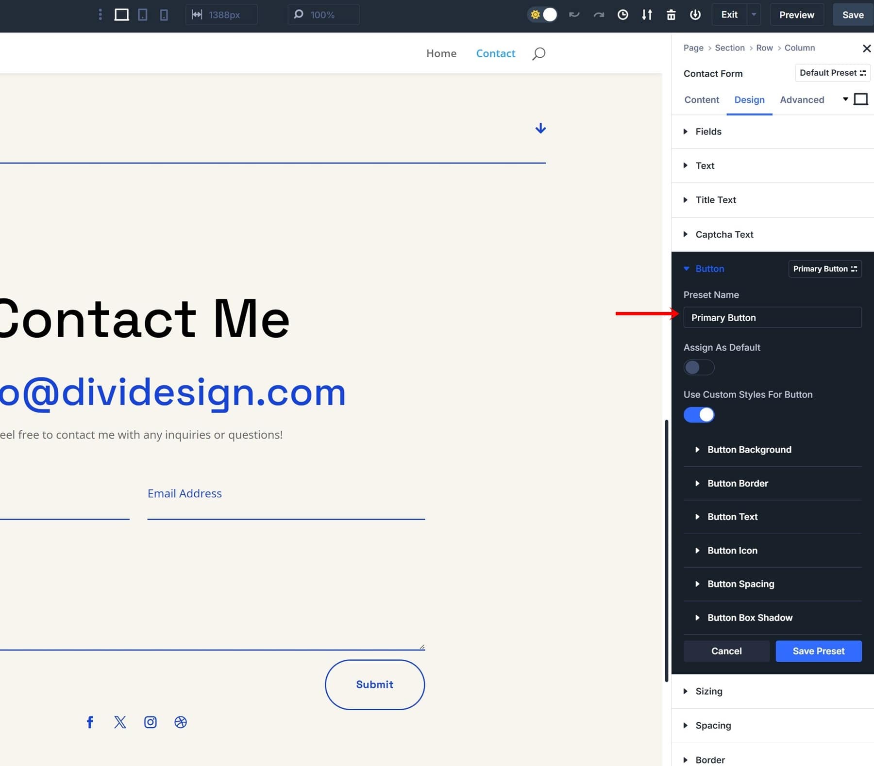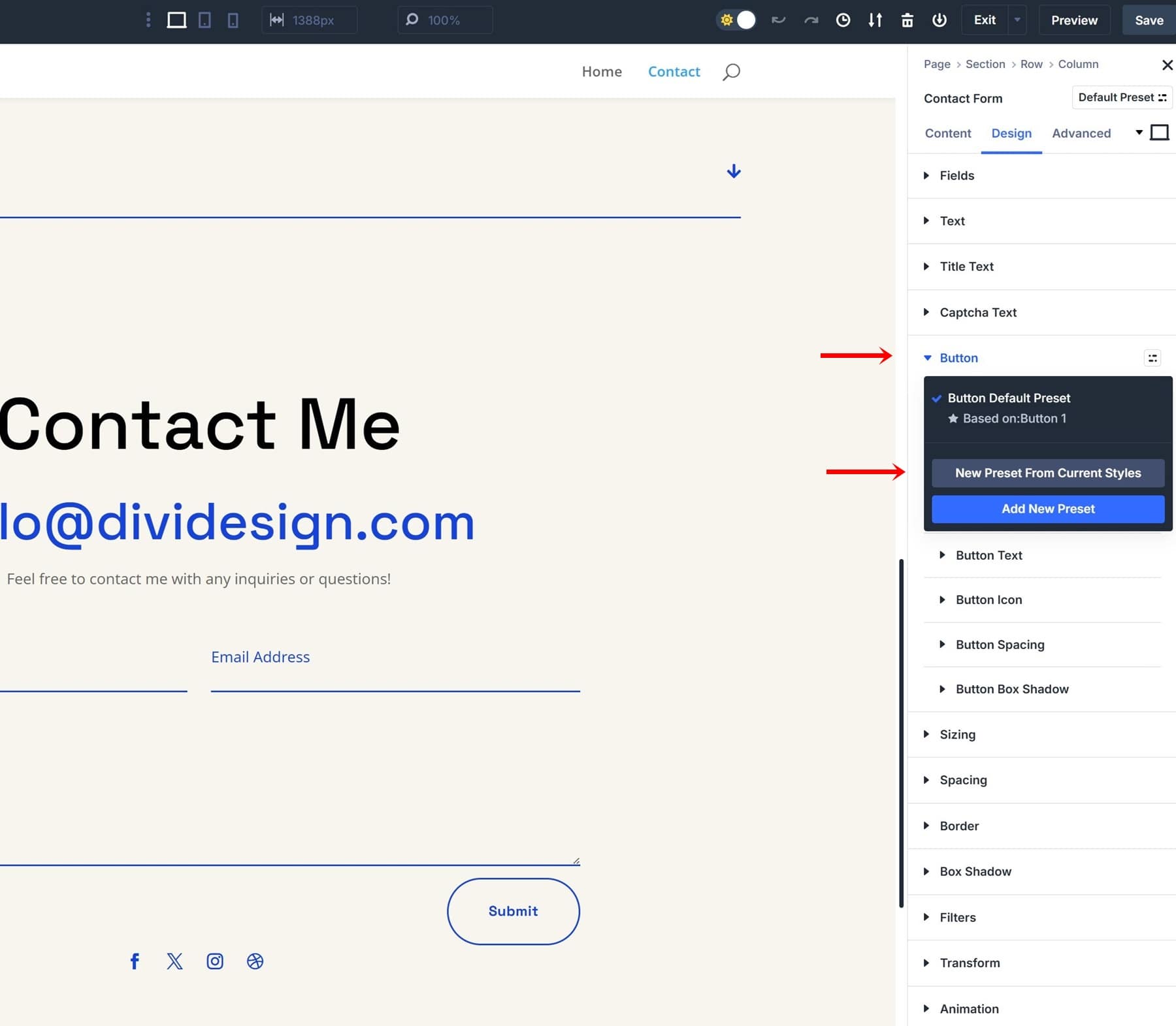 Creating an Option Group Preset is easy. You have two options; you can either create one from scratch or turn an existing static style into an Option Group Preset. Since we have a designed button inside our Contact Form Module, we don’t have to style it again, and we can instead reuse these settings for our Option Group Preset. Navigate to the Design tab and open the button settings.