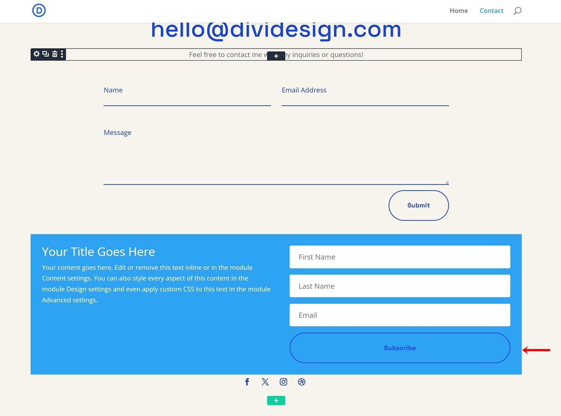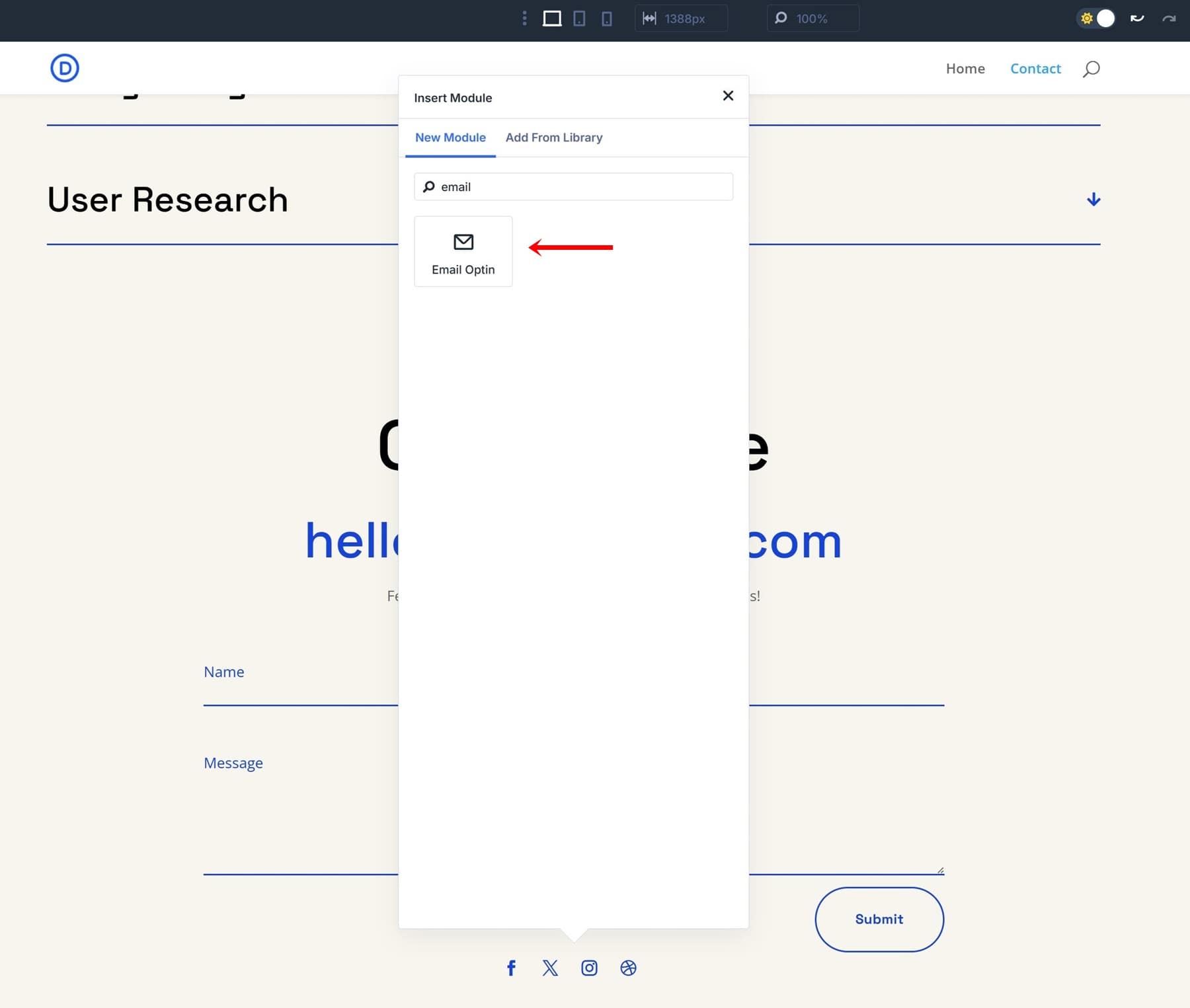 To see your new preset in action, add an unstyled brand-new Email Optin Module right below your Contact Form Module.