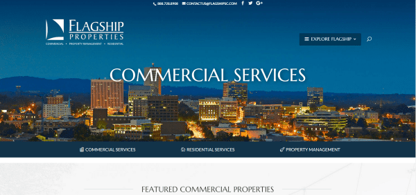 Flagship Properties displays a full-width image with an interesting mega menu and a menu under the header that remains on screen after scroll. Scrolling reveals property cards and a property search powered by IDX, a CTA and about section, an agent details strip, and a section with links to the blog, sales stats, and contact info. The various pages faintly display an image in the background that gives the pages a touch of texture. This one uses white along with bold reds and blues as highlights, giving a hint of the American flag in their branding.