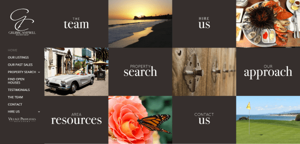Grubb Campbell Real Estate is one of the more unique designs on this list. It includes a masonry grid with horizontal menu. The grid includes images and links to the various pages. Scrolling reveals an about section with testimonials, a masonry grid of the available properties with address shown on hover, and a link to the contact page. The property search uses multiple realtor tools including IDX. The properties pages display images, video, details, and galleries. The listings grid approach is beautiful and fits perfectly into the unique design.