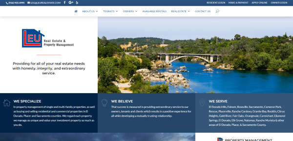LEU Real Estate places their company info front and center followed by property management links and contact info, a testimonial, and embedded Facebook posts. It includes login links in the top menu. The primary menu includes a homes for sale page with property detail cards. The individual property pages display the images with details and a tabbed section with more information powered by IDX.