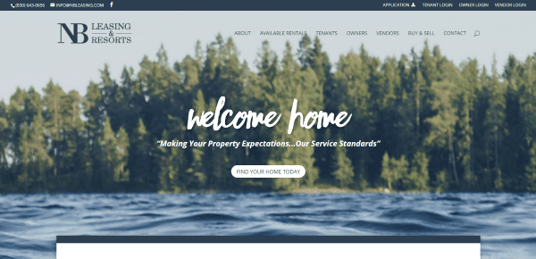 NB Leasing features a full-screen image with CTA overlay, company information in an overlapping section, location images, services with toggles, contact form, and map. It includes login links in the top menu. Listings are displayed with PropertyBoss Property Management Software and include galleries and property information. Tenants can pay through the site. The blurred backgrounds surrounding the boxed layout creates an interesting visual.