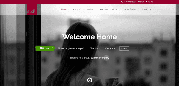 Room Space features a full-screen video with transparent menu and property search overlay, an about section, a contact section overlaying an image slider, member associations with logos, testimonials, and award badges. The search feature includes location and a calendar for check in and out dates. The Apartment Locations page includes stylized maps that fit the website’s branding and links to the locations. The location pages include a nice property gallery with information and enquiry CTA.