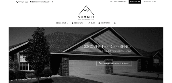 Summit NWA includes an image slider with CTA, links to property locations, a section with contact form, testimonial, and FAQ, an about section, and a blog post section. The For Rent link in the menu goes to a property search page powered by PropertyBoss Property Management Software, allowing you to search based on selections from dropdown boxes. The Available Properties lists the properties with images and detailed information. Customers can log in using the links in the top menu. Aside from branding it doesn’t have a lot of color, but it is simple to use and easy to navigate.