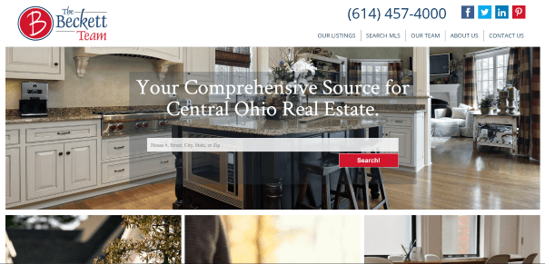 The Becket Team places a listings search in an overlay over a full-width background, followed by images with links to pages for listings, search, and agents. A four-column grid provides links to buying information. It uses MLS to display and search listings, which provides a map with multiple pins and result details appearing in the sidebar (on a non-Divi page). The team page displays images with toggles to see the bio’s. I find the menu design to be one of the most interesting on this list with its full height logo, phone number with social links, and menu link separators.