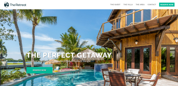 The Retreat includes a curtain menu without animation and a Call the Action (CTA), a full-screen image slider with two CTA’s and dot navigation, a tabbed section with text and photos of the villa and the area, links to the gallery and floor plans, another CTA and information section, and a stylized footer with a background pattern, email signup form, vertical social links, menu, and contact info. The reservation system includes a calendar to show availability and a signup form for booking.