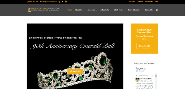 Crompton House features a clean design with a menu in the top information bar and a sidebar on the homepage. It includes a large image with CTA, information with images, downloads, and a masonry blog section in a grid which includes sliding animations on hover. The sidebar includes a CTA, the latest tweets, and an events calendar that shows more information on hover with a link to see the larger version of the calendar, which is powered by All in One Event Calendar. The website includes lots of detailed pages about the courses, academics, school life, events, and more.