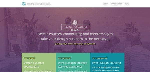 Digital Strategy School includes an interesting color palette, filters, and course information within the hero image. The homepage also shows the benefits, a CTA, course descriptions, testimonials, social proof, and lots of success stories. It uses different designs to show off the various testimonials and success stories. The Success Stories page uses block quotes and images to create testimonials. Clicking on one takes you to their alumni success story. This website places everything you need to know on the homepage in order to maintain a design with minimal navigation.