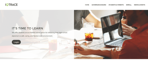 IQTrace has a clean homepage design that includes parallax, transparent overlays, several calls to action, social proof, school information, and a contact section. A page called Governance Board using a Person module to display images with social network links and a login so you can watched their board meetings online. The Students and Parents page has a login for the students, shows the benefits of the school, and shows parent testimonials. The Enroll page provides all of the enrollment information. News and Events is a blog. Each of the pages follow the same clean design of the homepage.