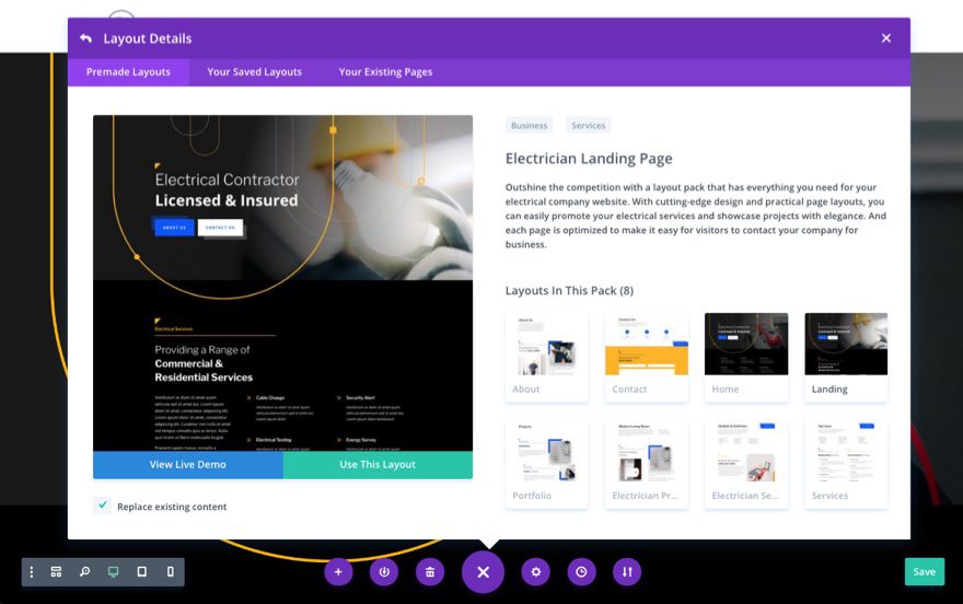 Under the Premade Layouts tab, you can easily find the new layout by scrolling through the list of layout packs. Once you find the Layout Pack, click on it. You will see all the individual page layouts included in the pack. Select the page layout you want to use and then click the “Use This Layout” button.