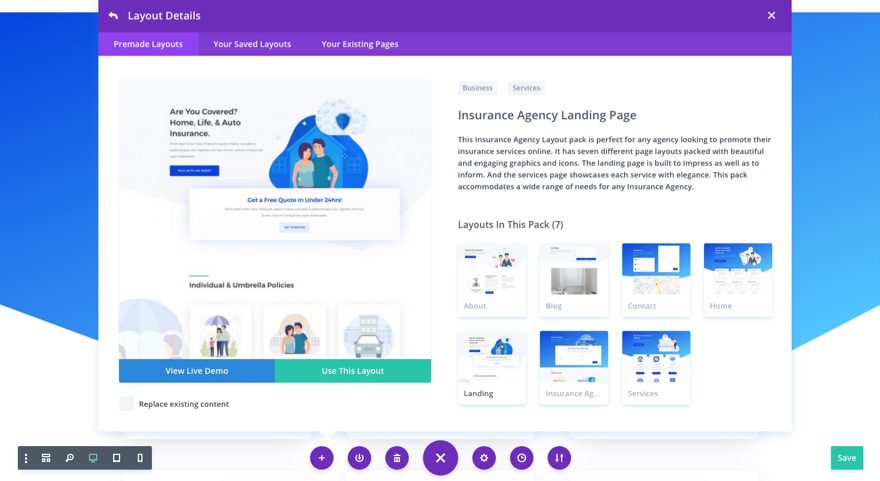 Under the Premade Layouts tab, you can easily find the new layout by scrolling through the list of layout packs. Once you find the Insurance Agency Layout Pack, click on it. You will see all the individual layouts included in the pack. Select the layout you want to use and then click the “Use This Layout” button.