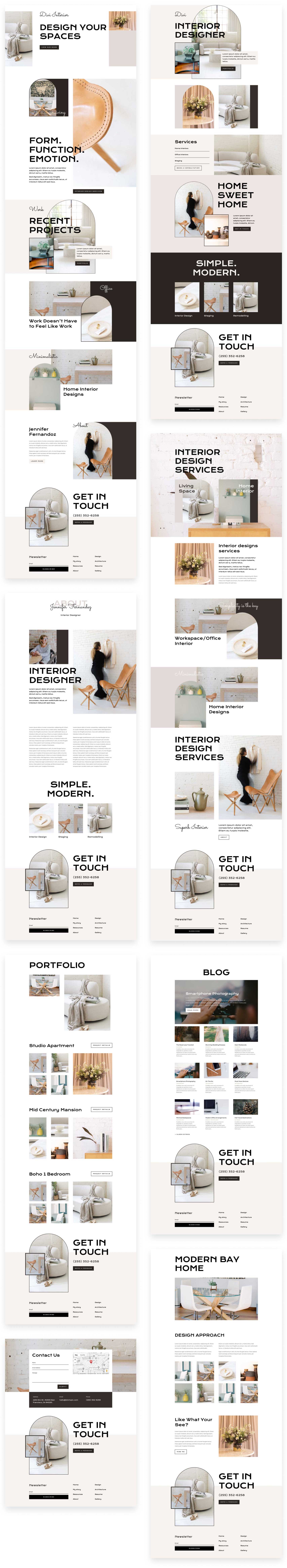 – 8 Premade page layouts strategically designed for any Interior Designer website (including a footer design)
