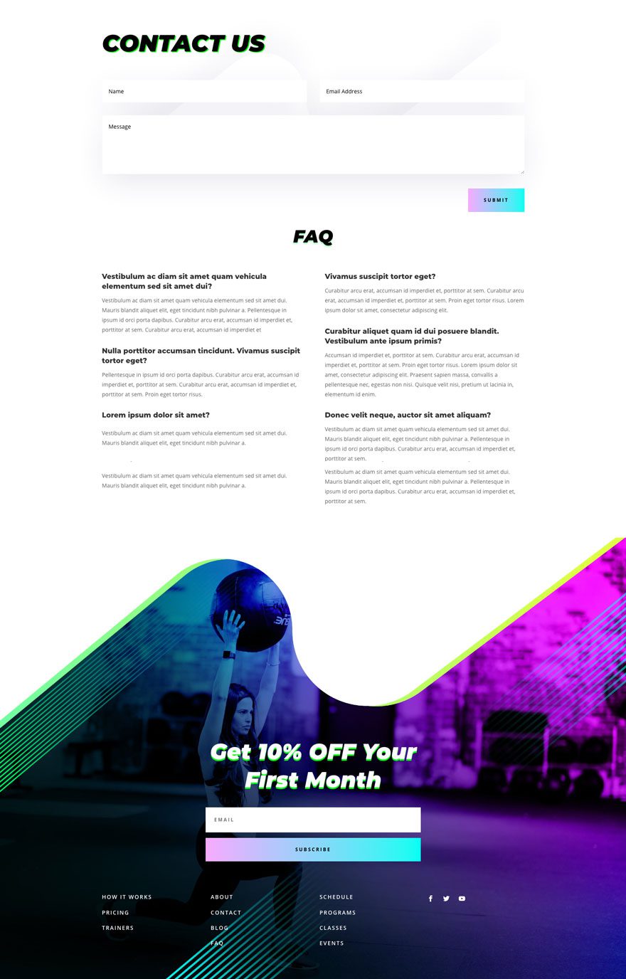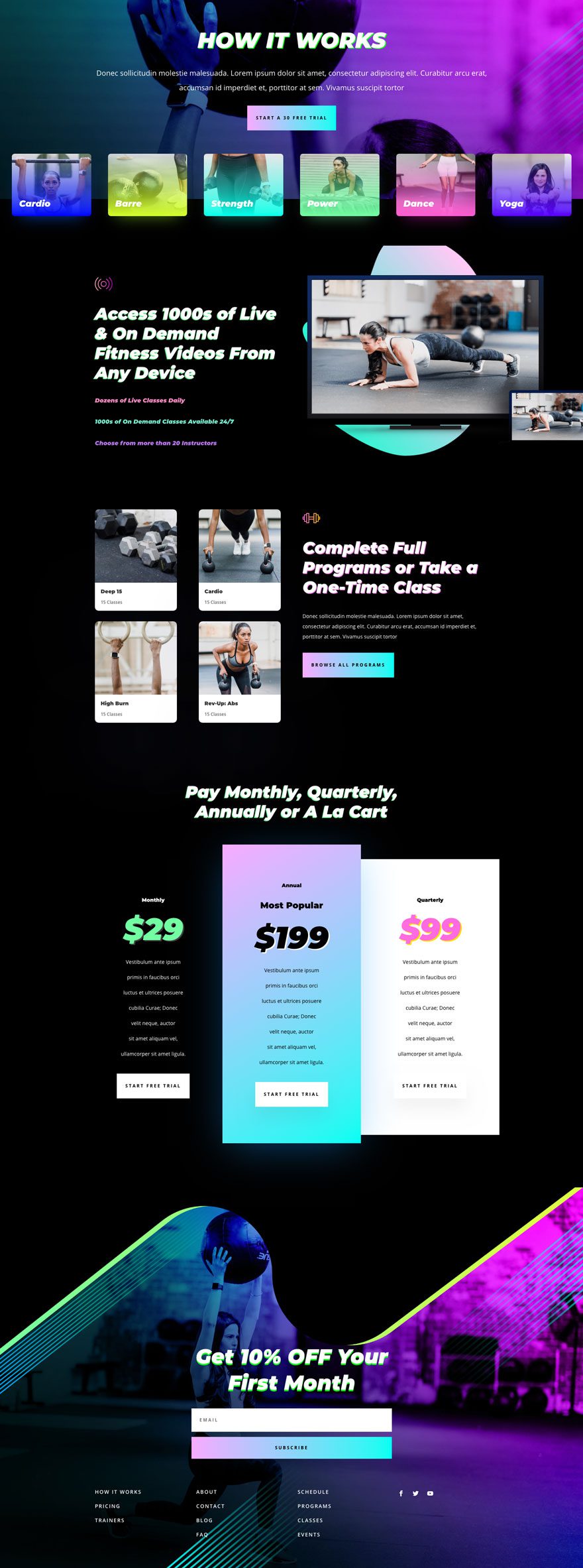 This pack features page layouts with bold fonts and striking color schemes to make the content pop. The colorful custom icons are also a great addition. The pack also includes dedicated layouts for showcasing classes and a unique “How It Works” page. Plus, the image assets provided, offer some great PSD mockups for customizing images to fit your site perfectly.
