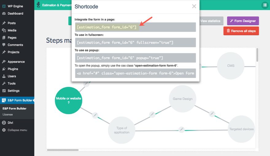 First, we need to grab the shortcode. From the form editor, click the gray Shortcode button at the top of the page and copy the shortcode that will integrate the form in a page.