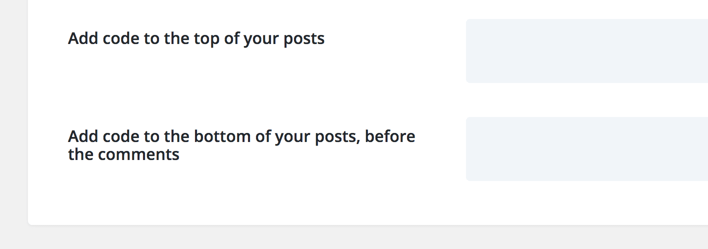 When you scroll down a bit, you will see text areas labeled “Add code to the top of your posts” and “add code to the bottom of your posts, before the comments.”