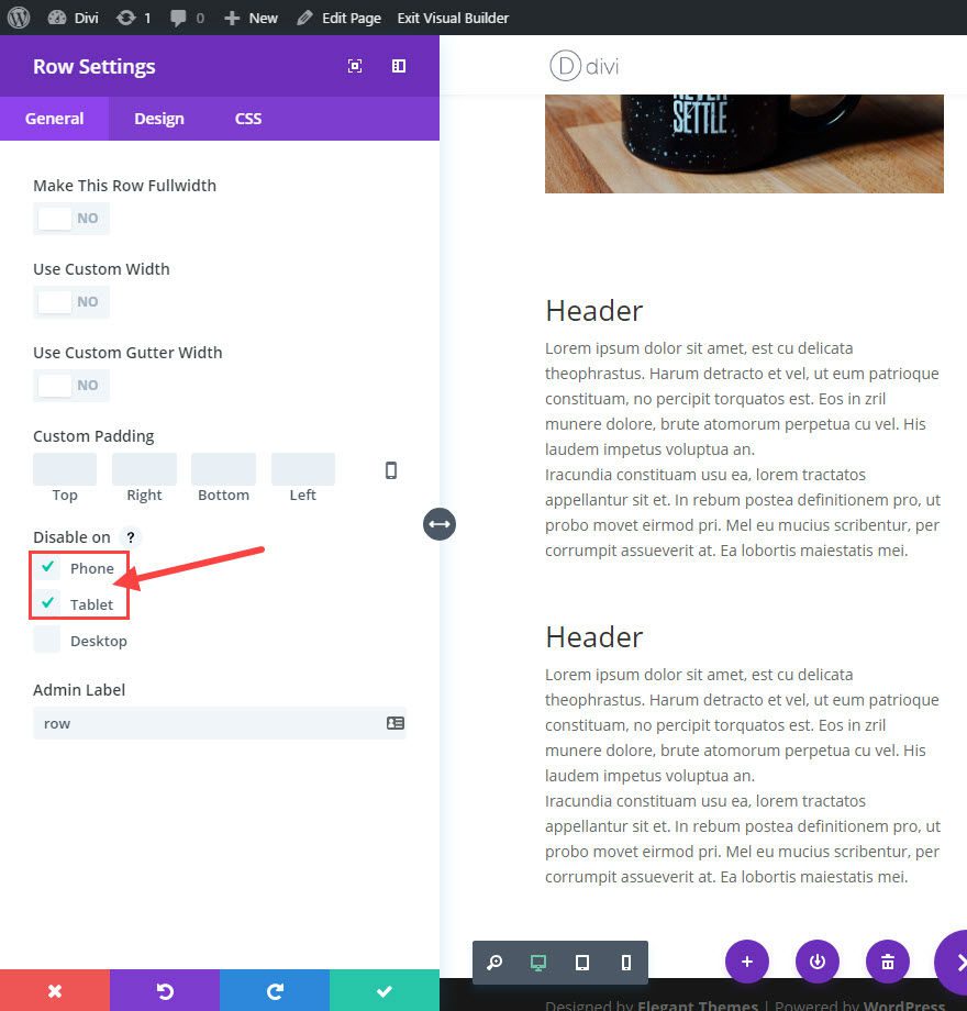 Under General Row Settings, check to disable the row on phone and tablet.