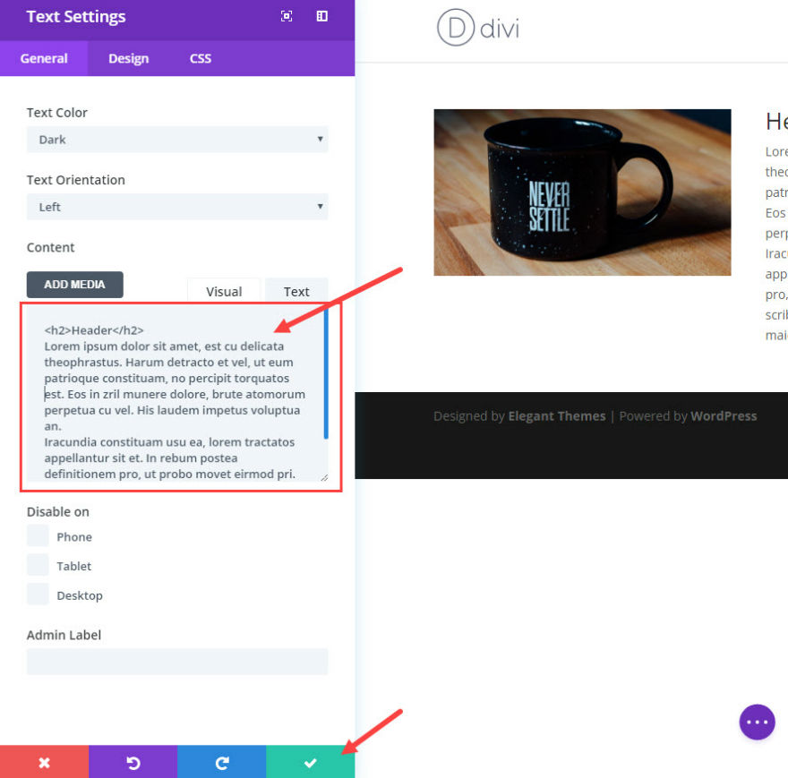 Under the General Text Settings, add your text to the Content text box.