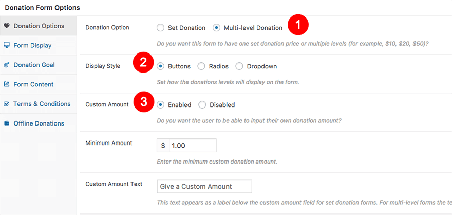 Next, you’ll notice the Donation Form Options. Let’s run through them tab by tab.