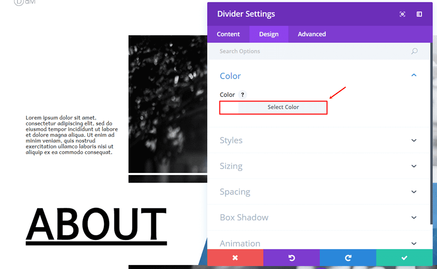 Next, go ahead and add a Divider module right below the Text Module. Within the Visibility subcategory, enable the ‘Show Divider’ option.