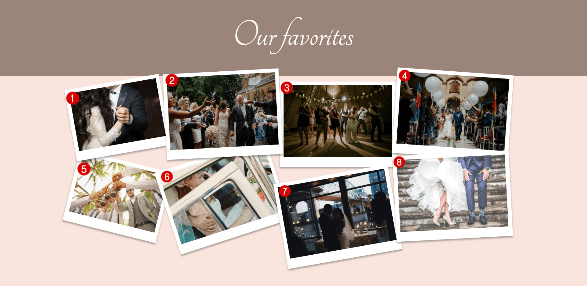There are usually a lot of pictures taken at weddings which can make it hard to find a certain structure in them. That’s why we decided to make the gallery section of this gallery page a little bit more easy-going. The galleries are going to be displayed based on the last name of guests, which makes it easy for them to find back their own pictures.
