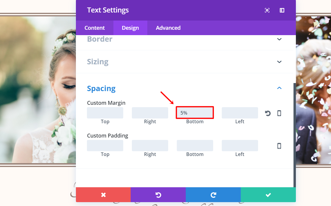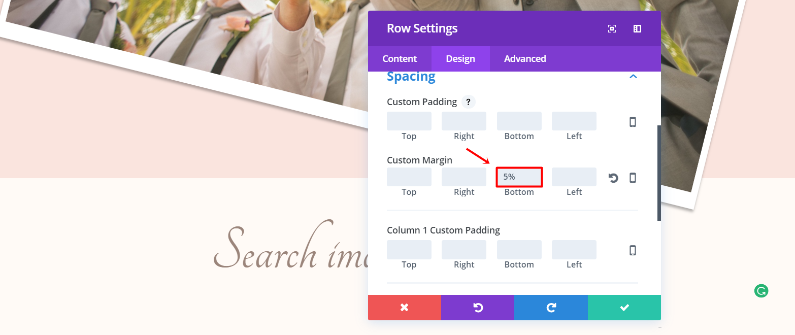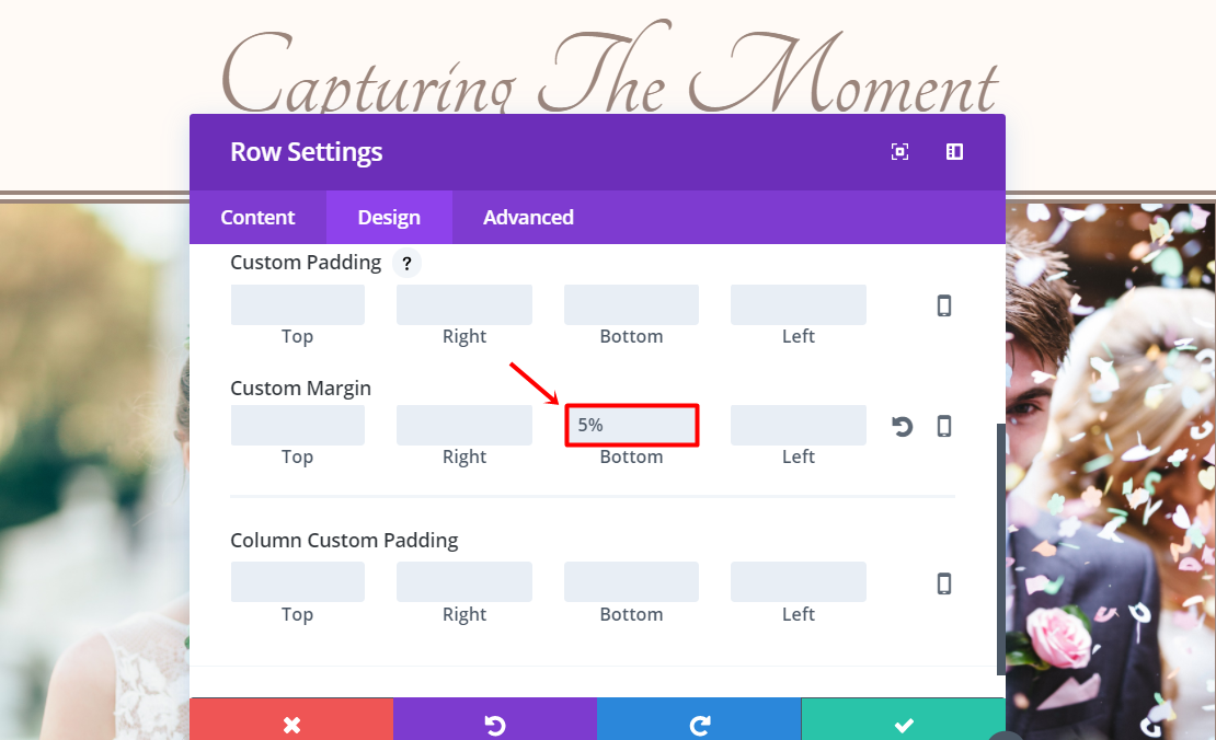 Next, go to the Design tab of the row settings and open the Sizing subcategory. Activate the Custom Width option and change the percentage to ‘60%’. Scroll down the same tab and add ‘5%’ to the bottom margin.