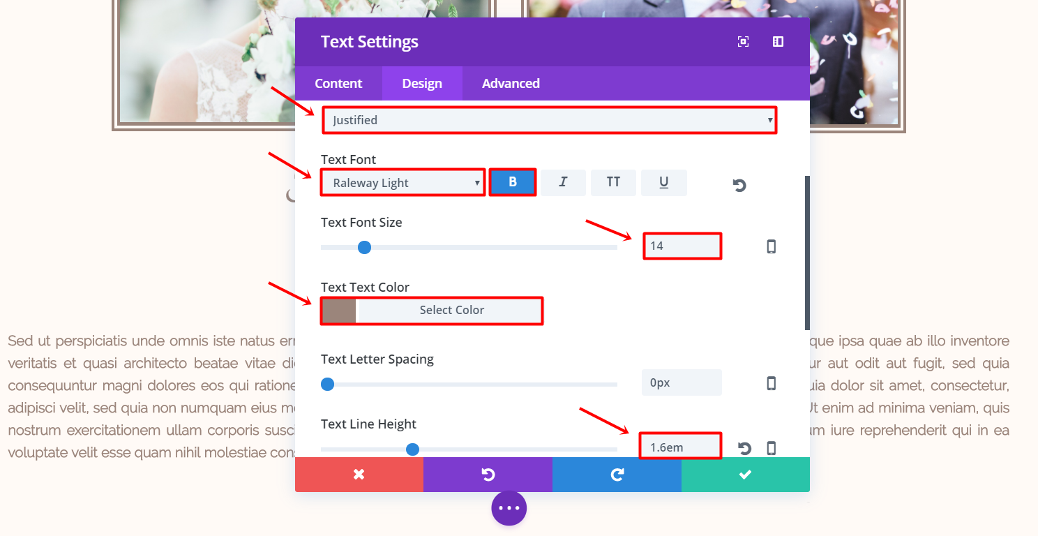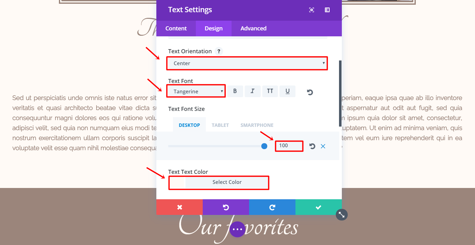 Create a new standard section and place a full-width row in it. Next, add a text module. Type down the text you want to show up in the Text subcategory of the Content tab. Then, go to the Design tab and make the following changes to the Text subcategory: