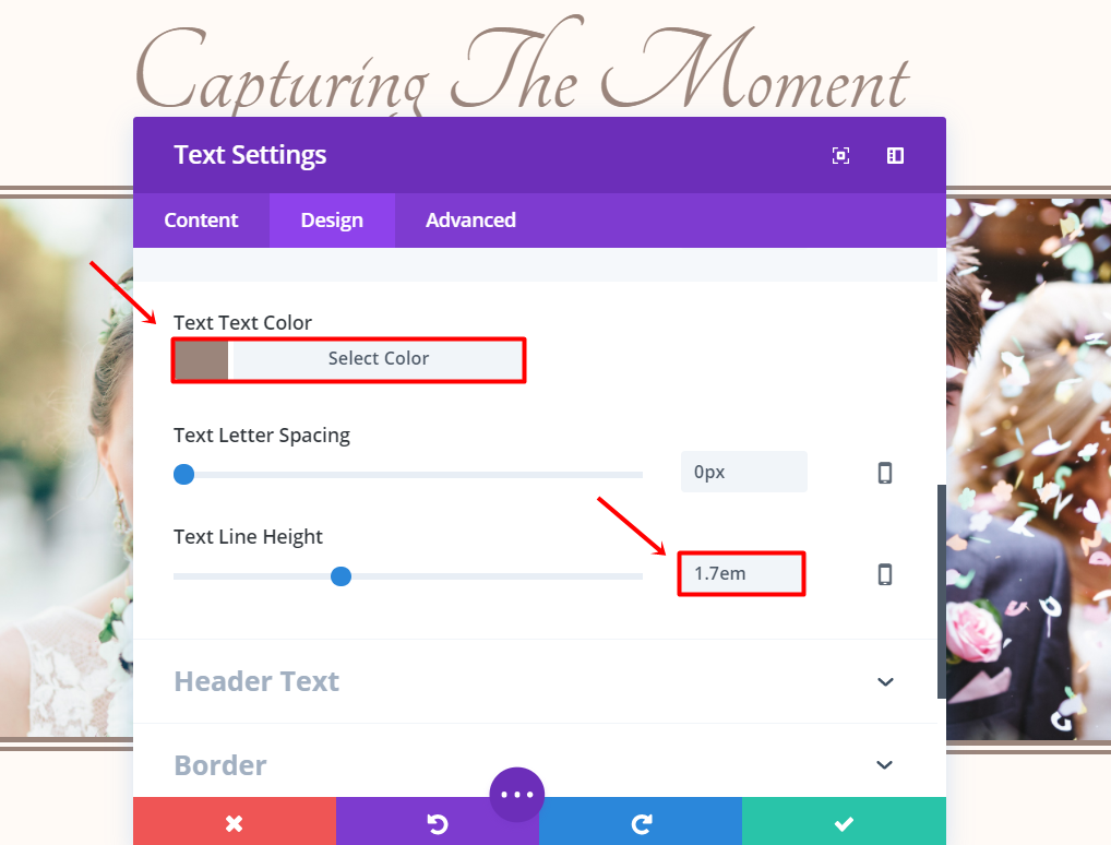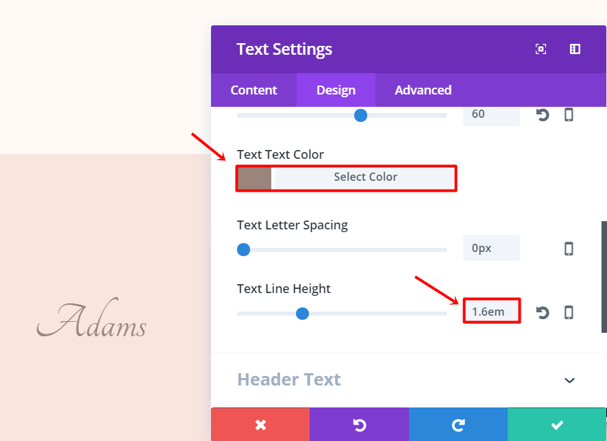 Next, add a text module to the row. Open the settings and enter the title you’d like to show in the text box of the Text subcategory. Moving on, go to the Design tab and make the following changes in the Text subcategory: