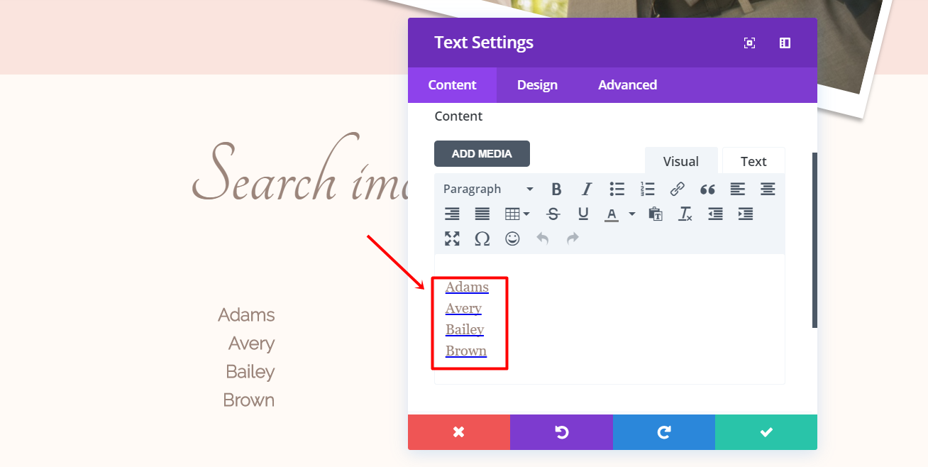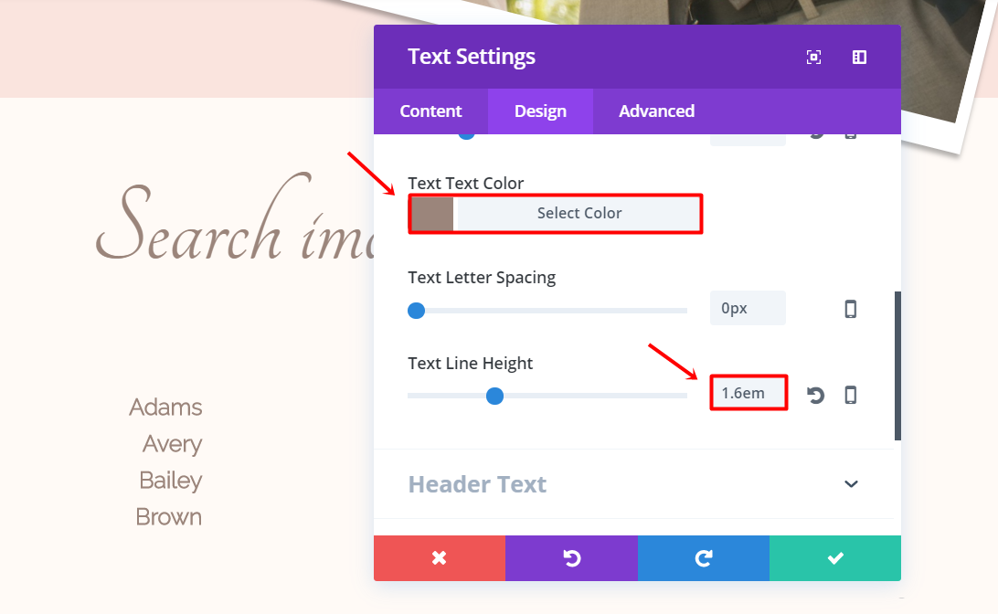 Now, add a Text Module and type down the last name of a family in the text box within the Text subcategory of the Content tab. Continue by going to the Design tab and making the following changes: