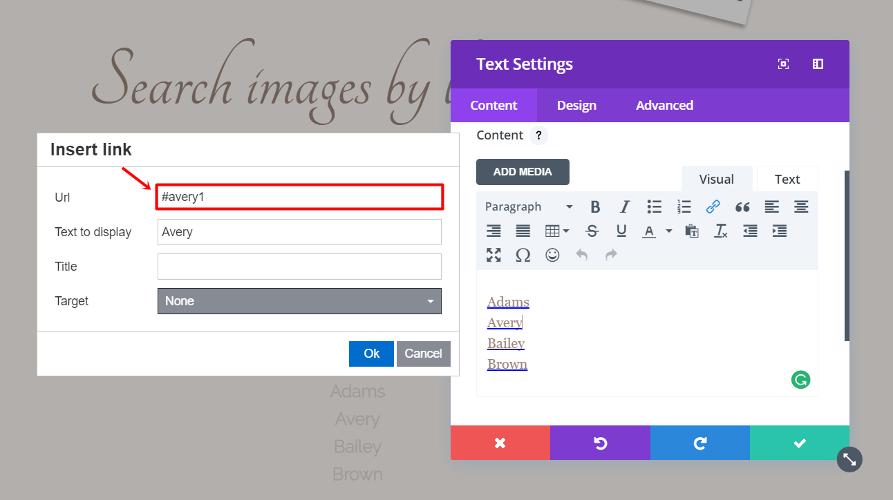 Next, add a text module to the left column of the row. Within the text module, add one-third of the guests’ last names. Each of these last names will need an anchor link to the part of the website you want to bring them to. Select one of the names, click on the link icon and write a ‘#’ + the name. Later on this blog post, you’ll link this name to a certain section. Repeat the same thing for each one of the names on the list.