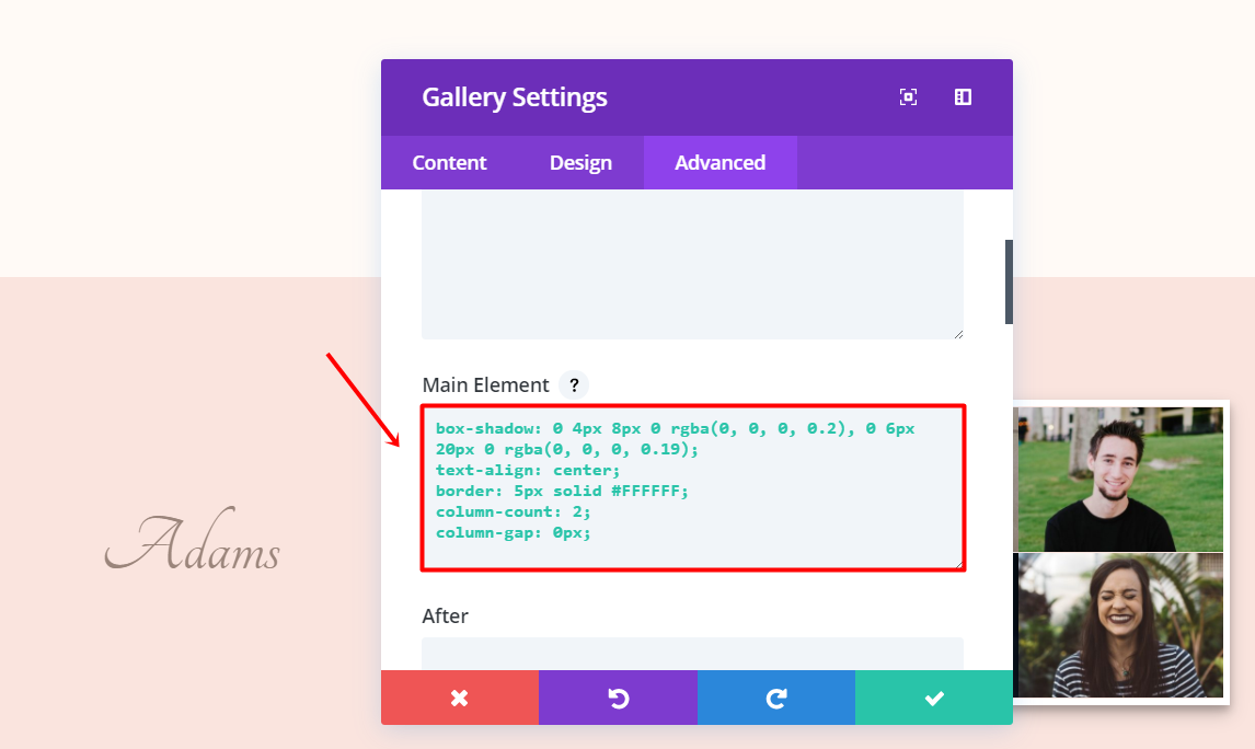 Next, go to the Advanced tab, click on the CSS ID & Classes subcategory and type down ‘polaroid’ in the CSS Class field. In the Main Element field, add the following code: