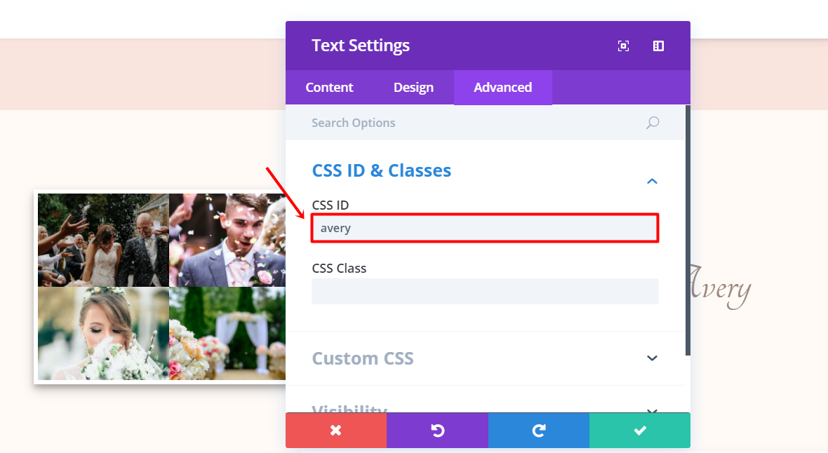 Move on to the Advanced tab. In the CSS ID field of the CSS ID & Classes subcategory, you’ll have to link the anchor link you’ve made above to the Text Module. So, if the first anchor link in the list was ‘#adams’, then you’ll have to fill in ‘adams’. Make sure the ID is the same as the one you linked to the name in the list you’ve made before.