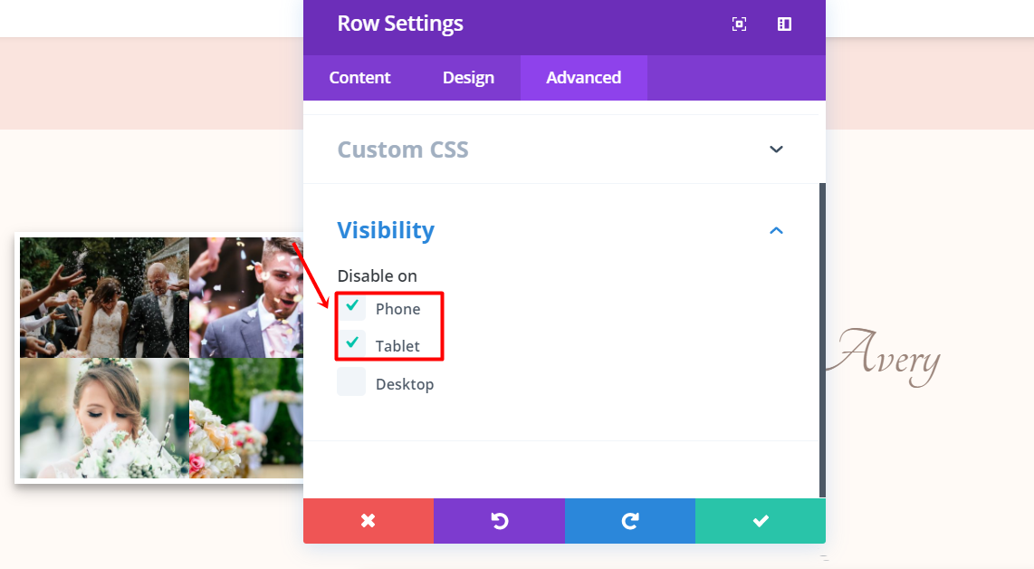 Now, go to the Advanced tab of this row and hide it for tablets and phones within the Visibility subcategory.