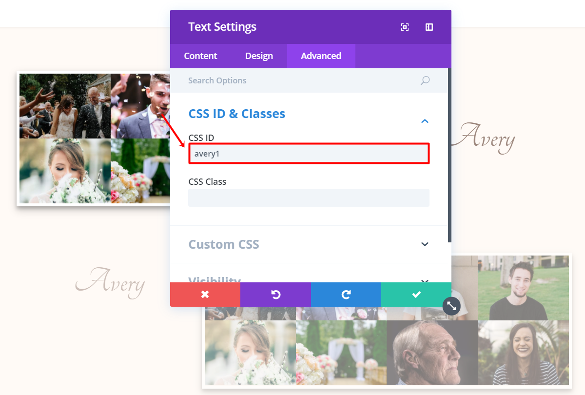 Then, open the Text Module options. Go to the Design tab and remove the top margin in the Spacing subcategory. Next, go to the Advanced tab and change the CSS ID in the CSS ID & Classes subcategory to ‘avery1’. This is the same ID as the in the list that applied to tablets and phones.
